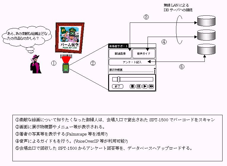 博物館等で良く見かける音声説明レシーバーの変わりに、SPT-1500を使えないかという発想です。PalmOSベースのSPT-1500ならばGUIによる操作が可能であり、またサーバー等の連携も比較的容易に実現できるので、従来のレシーバーに比べてもメリットが大きいと考えられます。