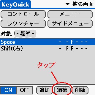 Spaceキーにサイドメニュー1を割当てたら、再度拡張画面に戻りSpace項目を選択後、「編集」ボタンをタップ