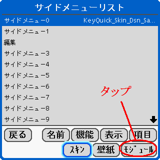 「サイドメニュー0」項目を選択してから、「モジュール」ボタンをタップする。※「スキン上にモジュール配置が定義されていません」等のエラーが表示される場合は、スキンにKeyQuick_Skin_Dsn_Samp1が設定されていない可能性があります。再度スキンを設定してください。