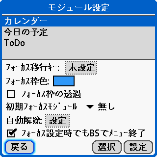 モジュール設定が画面が表示されので内容を確認して「戻る」ボタンをタップします。なお、「選択」ボタンをタップすることで、利用可能なモジュールの一覧が表示され、選択することができます。また「設定」ボタンをタップすることで、リスト上で選択されているモジュールの設定画面を開くこともできます。※サイドメニュー0は標準でモジュールが設定されていますが、他のサイドメニューでは設定はされていません。