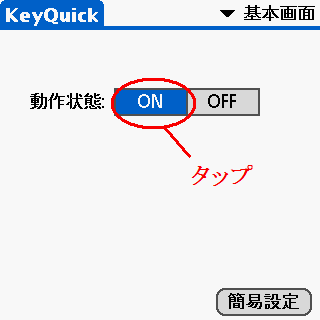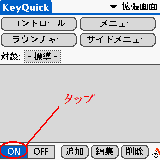 上記例では、KeyQuick 導入直後の画面である「基本画面」での操作ですが、「拡張画面」に切り替えているときは、ONボタンは以下の位置でタップします。