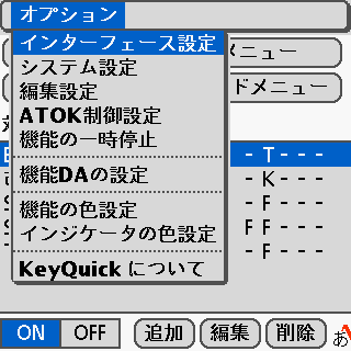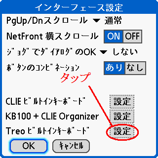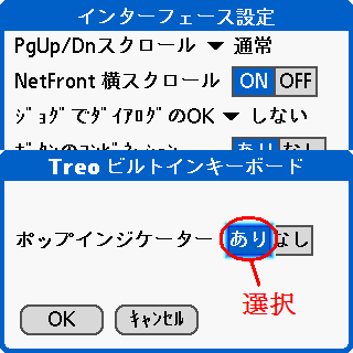 「ポップインジケーター」項目の「あり」を選択して、「OK」ボタンをタップ。※CLIEの場合は「CLIEビルトインキーボード」の方を選択すると同様の設定項目があります。