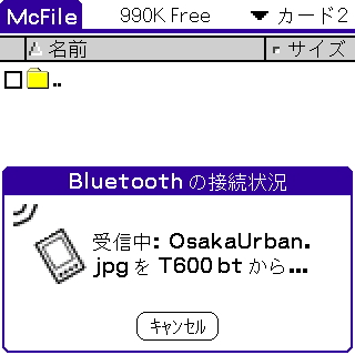 こちらも操作は赤外線と同様ですが、現状では Bluetooth によってメモリーカードがスロットに挿入できないため、メモリーカード上に直接ファイルを書き込むのが困難な状況です(実はあることをすると出来るのですが)。