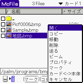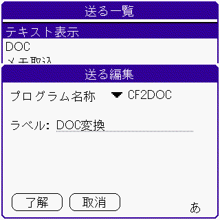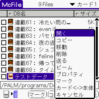 変換したいファイルをチェックして(複数選択可能)、ポップアップメニューから「送る」->「DOC変換」を選択 DOCデータベースとしてPalm内に取り込まれます。