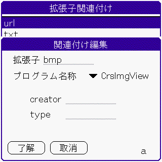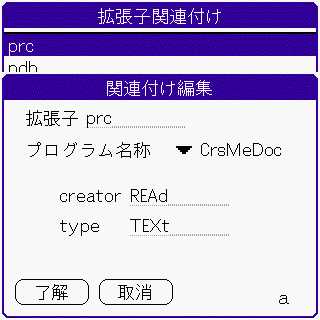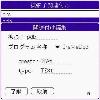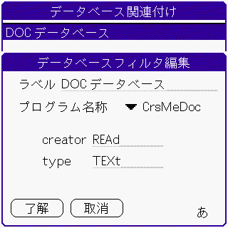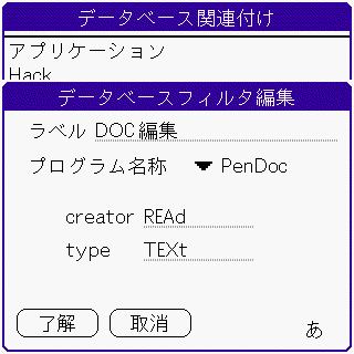 DOCファイルはPalmデータベース形式なので、creatorとtypeを指定することに注意。 また、DOCファイルの拡張子はprcとpdbの場合があるので、両方を指定する必要があります。 データベース関連付けは特に注意する点はありません。