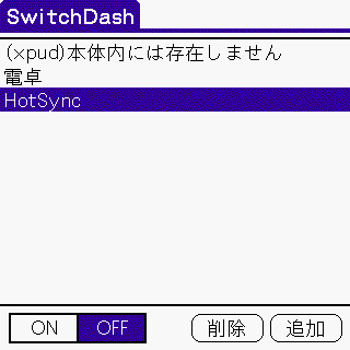 メイン画面 メイン画面から「追加」ボタンをタップすると表示されます ON をタップすると、リセットして常駐します ダウンロード -> SwDS044.zip