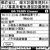 私は、電車で移動してるときに PalmPilot を使っていて、ふと「さっきのTRAIN の検索結果が見たい」と思うことがあります。基本的にはメモ帳等に結果を残しておけばよいのですが、それでもアプリケーションを切り替えるのは、ちょっと面倒な感じがしていたので、以下のような特徴を持った DA TRAIN Viewer を開発しました。