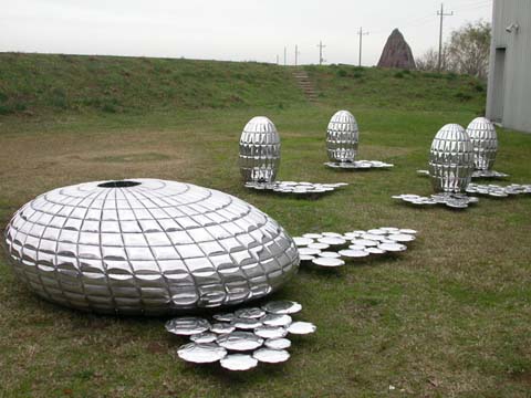 金属を主体とした立体彫刻を制作、空気を使って形を成形しています。特に最近ではアルミニゥムを多用しています。固い冷たい印象のある金属 (特にアルミニゥムやステンレス等)を空気のチカラで成形して、柔らかく軽い印象を加え、生命の持つ力強さを表現できたらと考えています。
