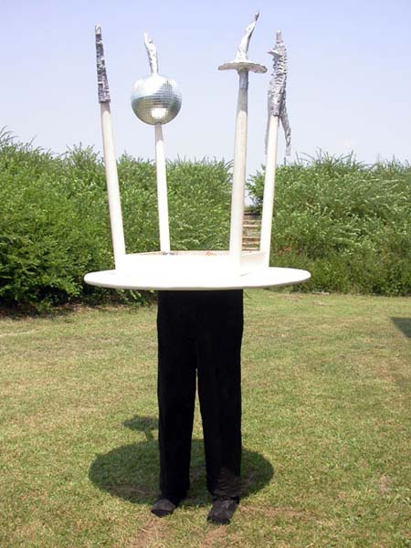 「社交辞令の会話をし、並べられた食事を口に運び、流行の曲で踊る。」円卓で催されるパーティーは社会そのものの縮図である。逆さまになった円卓は世の中への<疑問?> <不安>。作品を観る人に社会への<新たな視点>を問うている。