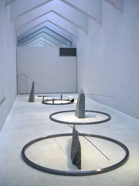 今展では、独自のスタイルで、金属と花崗岩を組み合わせてMETAL ART MUSEUM HIKARINOTANIの白い矩形の空間に、「枯山水」(と感じられるもの)を造景します、作庭のルールでは、3石または5石を基本として配置することになっています。歴史的、精神的(禅宗的)背景のもとに、「枯山水」は、見えないものの中にそのものを見、自然と向き合い、自らの存在を一体化させることで、自分自身を見出そうとする心理的な作用があります。日々、変化する社会状況の中で感じる周囲の喧噪から離れて、「静寂」な時間と空間を感じとれるものとして、また、ひとときの気持ちの余裕と何らかのイマジネーションを喚起するような「場」を構成します。