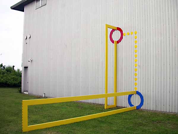 牛膓達夫の作品は金属でつくられたモノではなくて、空気のなかにそっと挿入された光のようではないだろうか。かたちはさりげなく繰り返されずらされて「対」か「双」かのダブルネス(二重性)状になっている。この「繰り返し」と「ずらし」によるダブルネスのかたちが色を巻き込んでまわりの空気に波紋を起こすのだ。波紋が同じ場にいるわたしたちの身体感覚を揺り動かす。